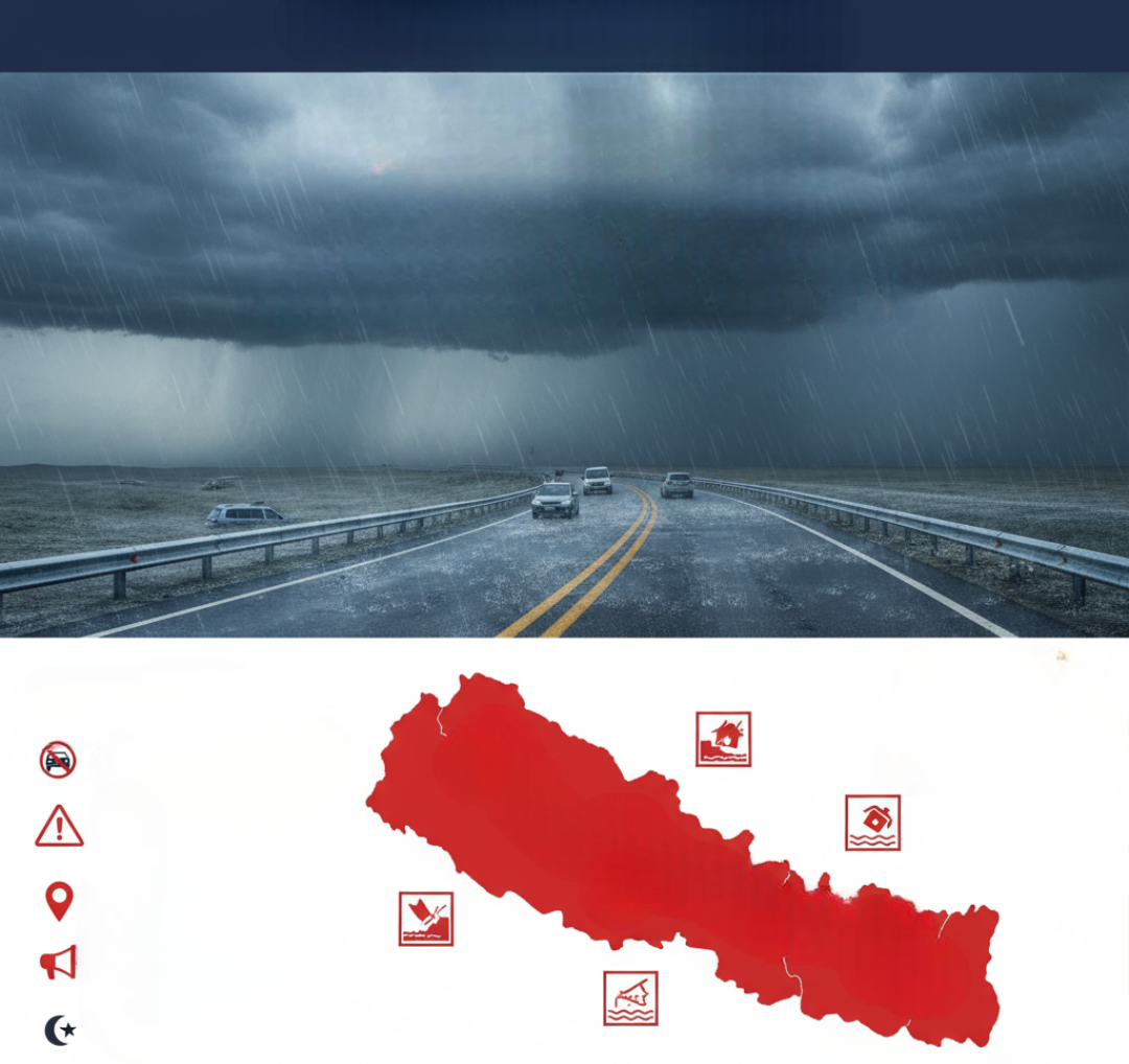 भारी वर्षाको सम्भावना: अत्यावश्यक बाहेक यात्रा नगर्न NDRRMA को आग्रह, ५ प्रदेशमा सतर्कता
