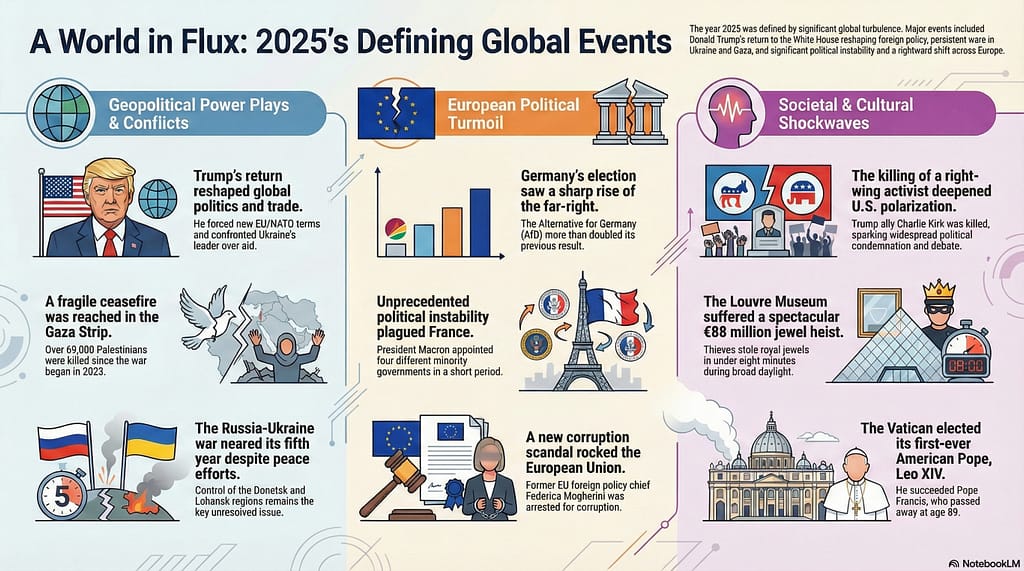 Donald Trump’s return to the White House significantly reshaped global politics in 2025, and the change was strongly felt within the United States (U.S.) as well. Trump also shook the global economy by increasing tiffs on imports from almost all countries. He forced the European Union (EU) into an unfavourable trade agreement and NATO member states to raise defence spending to five percent of GDP. He restored diplomatic relations with Russia and adopted a confrontational stance toward Ukrainian leader Volodymyr Zelenskyy, whom he “lectured” while shouting at him in the White House. In exchange for continued support for Ukraine, he sought and obtained access to its strategic minerals. He invested considerable effort in ending Russia’s war against Ukraine, but has not yet succeeded, despite some progress. Trump’s second term was also marked by military engagement against Venezuela, for now limited to deadly strikes on dozens of ships, under accusations of attempting to smuggle drugs into the U.S. Within the U.S., Trump initiated mass deportations of illegal immigrants, dismantled parts of the federal government, including USAID, and continued sharp attacks on opponents and the media.